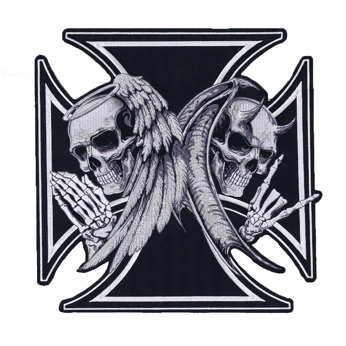 The iron cross has been a staple symbol of bikers for decades. The fight between good and evil has been a struggle since the beginning of time. Our angel and devil skull depicts this eternal struggle. So the combination of these two concepts makes this one of our top selling designs.