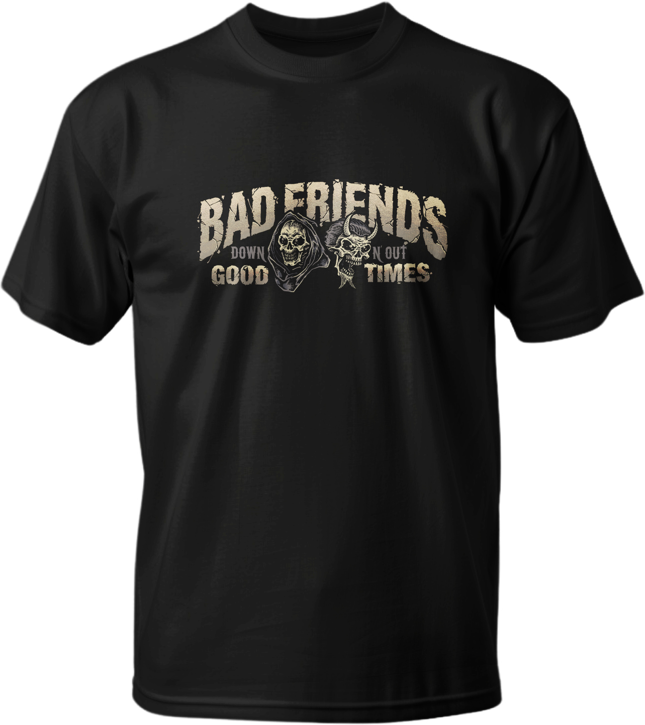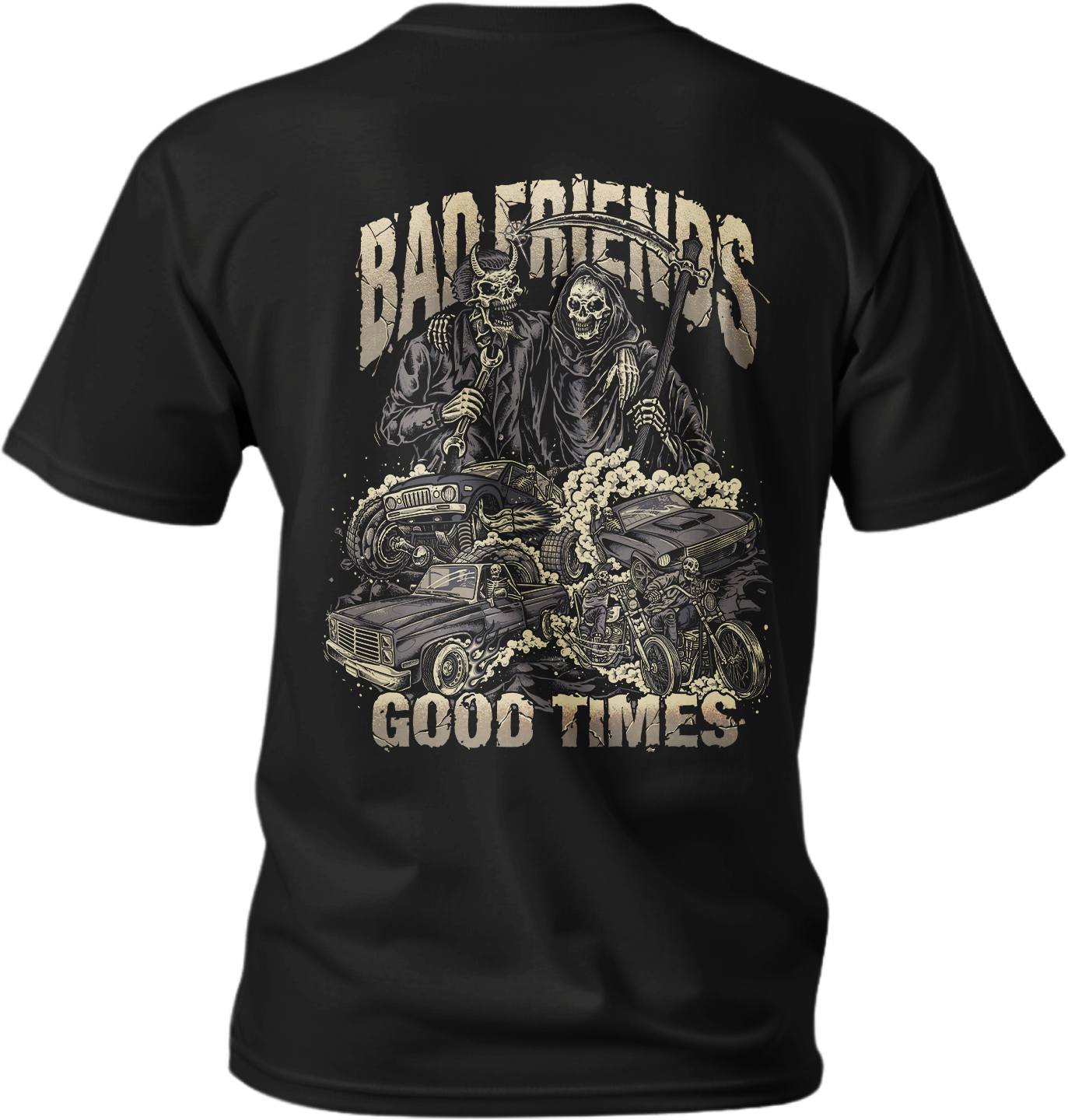 "Bad Friends, Good Times" isn't just a slogan—it's a lifestyle. This tee is for those who know that the best memories are made with a crew that rides hard and lives even harder. Whether you're tearing up the streets or hanging with your squad, this shirt is your badge of honor. It’s more than just clothing; it’s a statement that you're all about the thrill of the ride, the adrenaline of speed, and the loyalty of true friendship. Perfect for those who live for the moment and aren't afraid to show it.