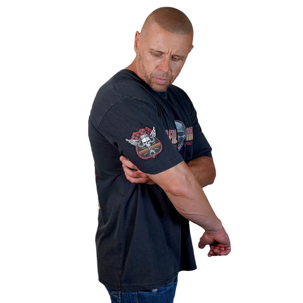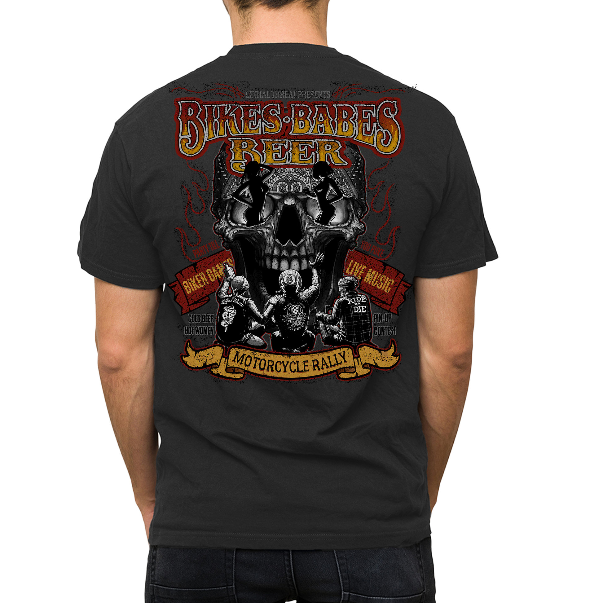 We have increased the sizing of this new vintage washed shirt from previous production. "Real Man Sizing" is a looser, bigger more comfortable fit. Combined with our hand drawn graphics of our Bikes, Babes and Beer Skull, sleeve applique, custom Lethal Threat trims and a super soft wash black color. This shirt is a must have!