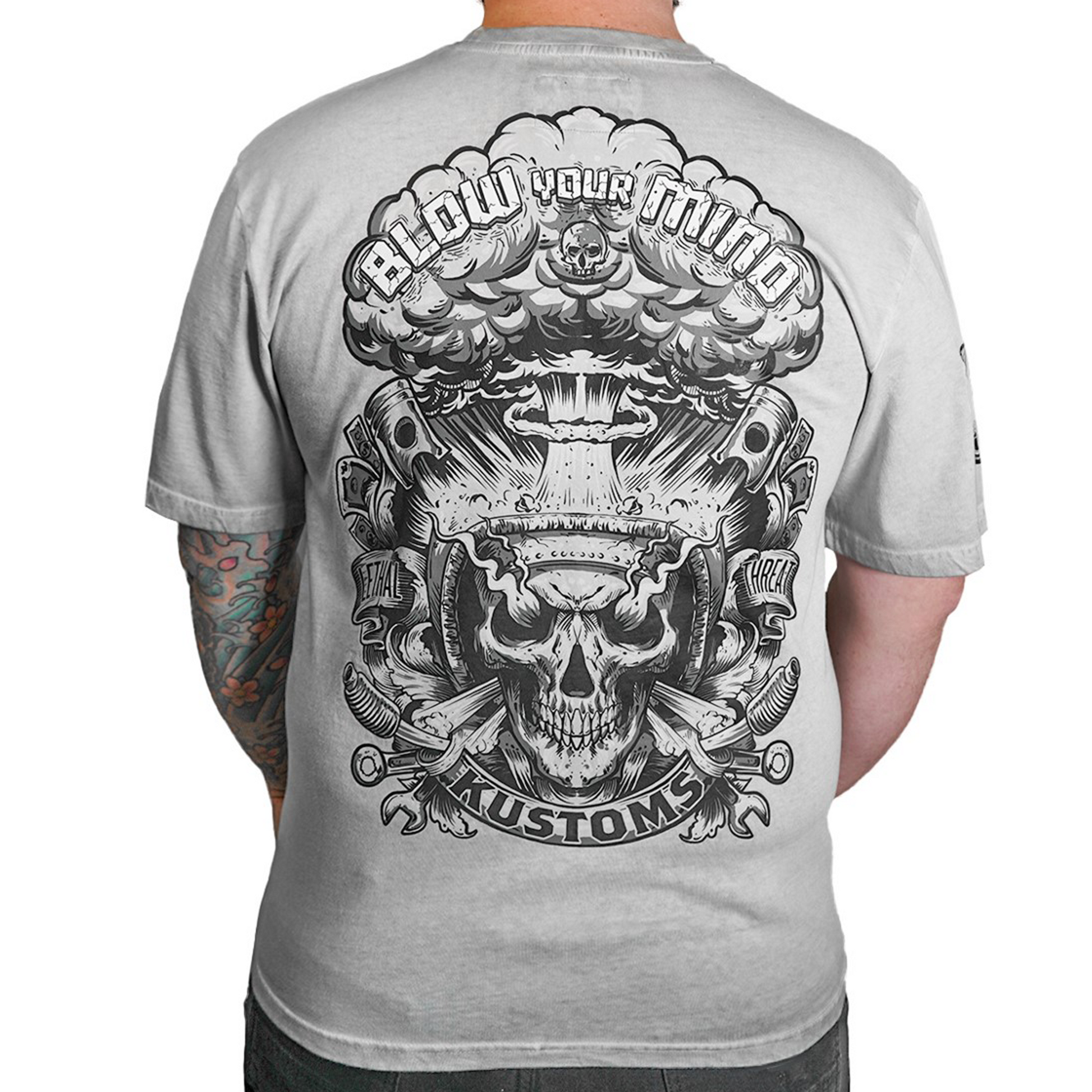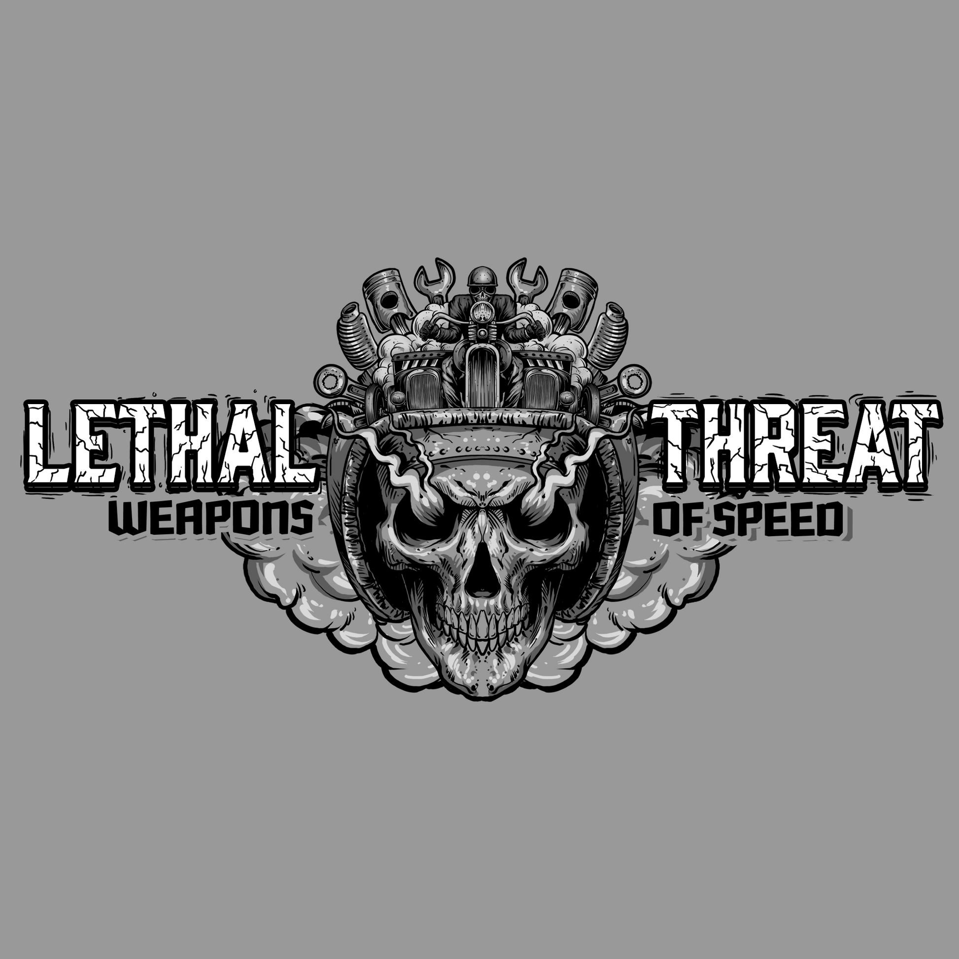 Here’s another incredible vehicle design on one of our shirts. It looks just like a classic hot rod drawing, but with a Lethal Threat twist. Fire blasting out the exhaust, smoke and dust in the air behind them, a skull on the grille, and a skeleton behind the wheel. If you’re looking for new clothes to represent the kustom kulture community, look no further.