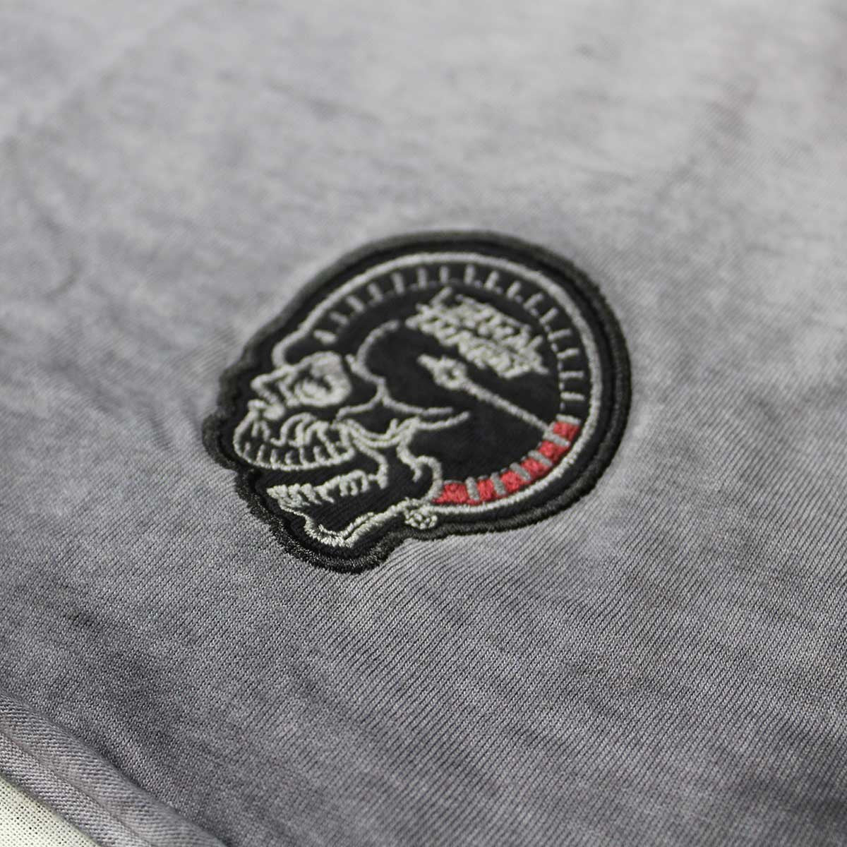 To add to the Vintage look , each shirt has hand distressed edges, distressed sleeve patch and machine enzyme wash for a softer hand feel
