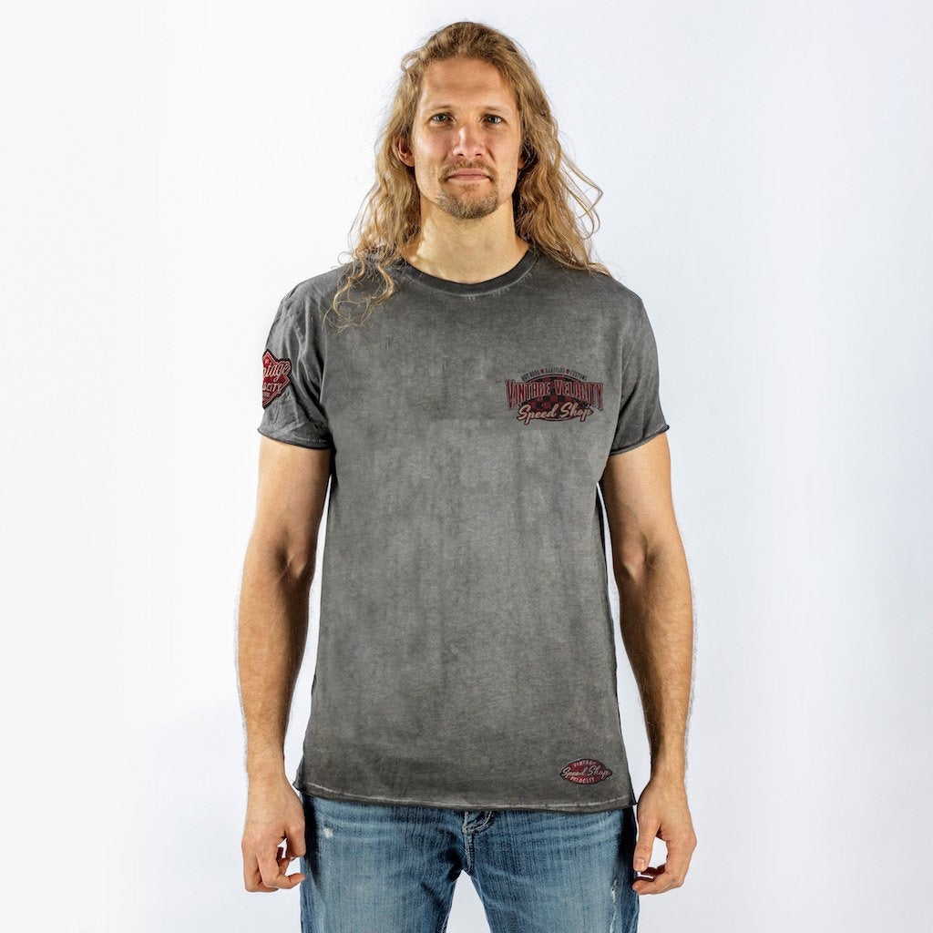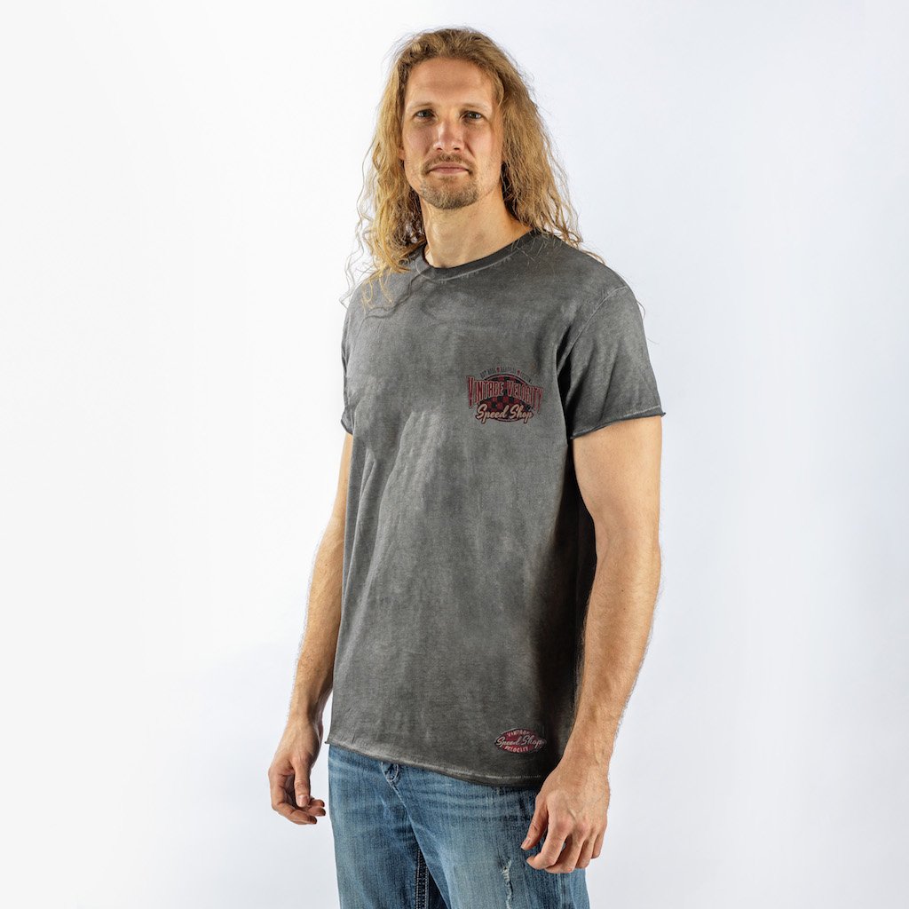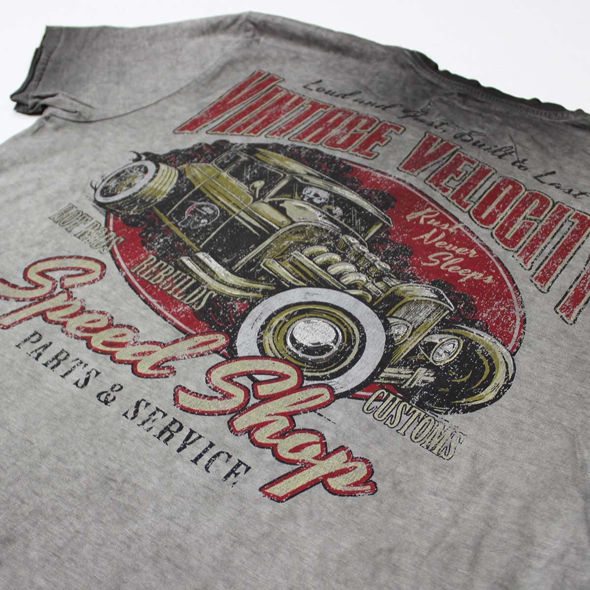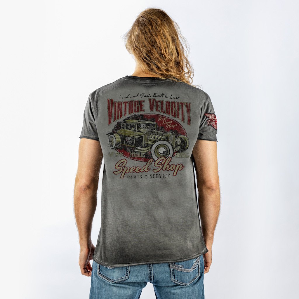 Adding to the vintage look are distressed edges, a distressed sleeve patch and machine-enzyme wash for a softer feel. That means the biker tee comes with a worn-in feeling that feels fine the moment you put it on. These motorcycle T-shirts have a fitted cut; order one size up for a looser fit. Get your Vintage Velocity Hot Rod Speed Shop tee here.