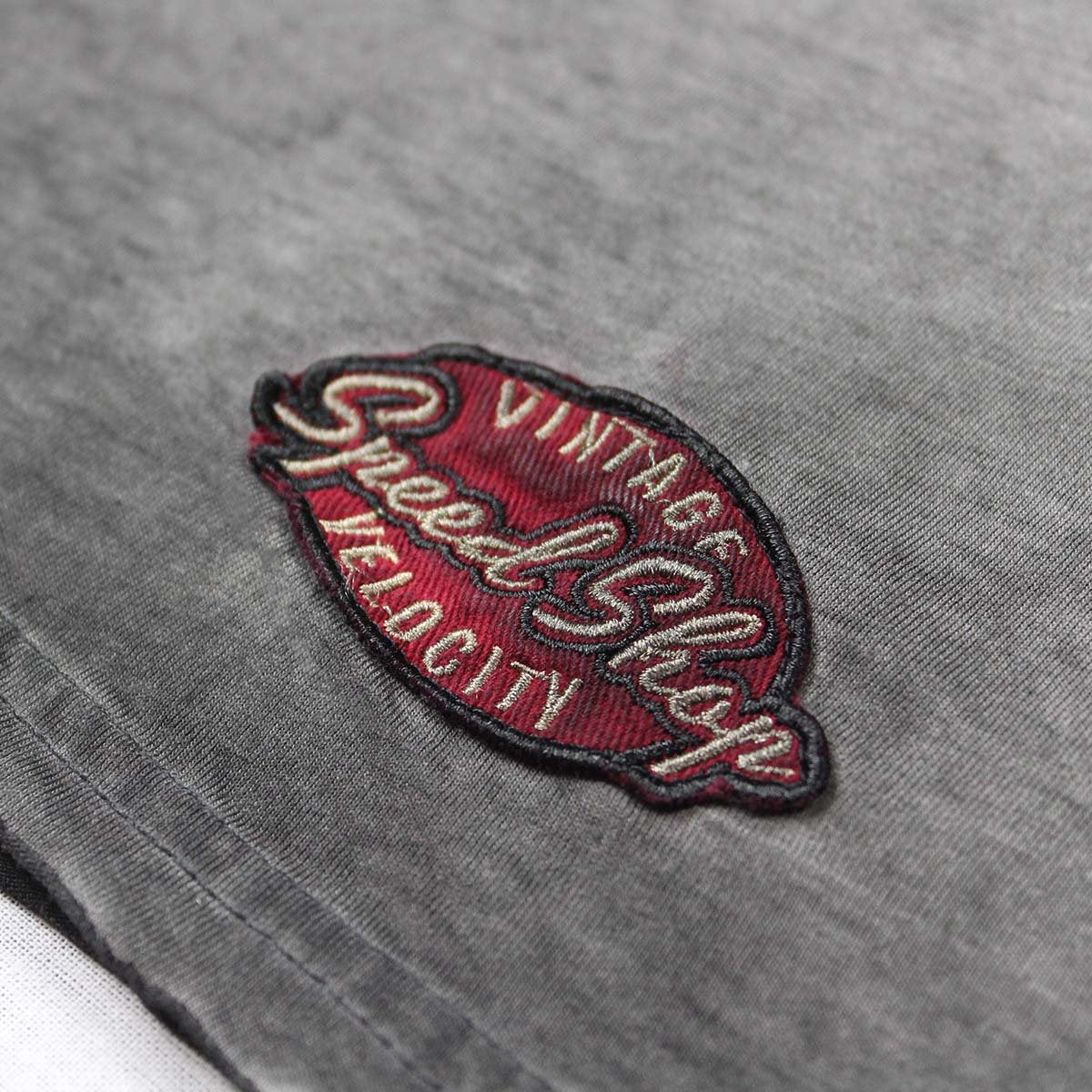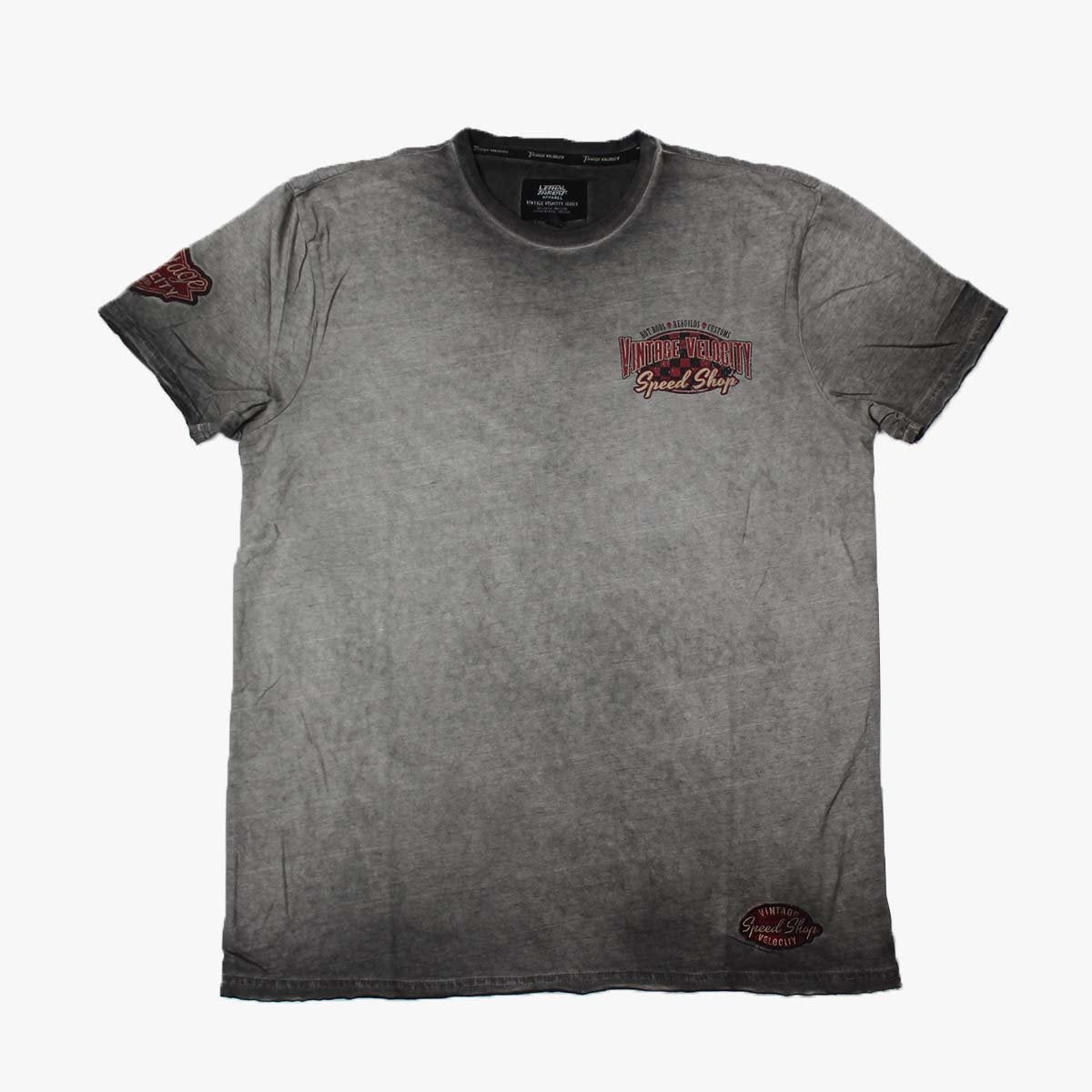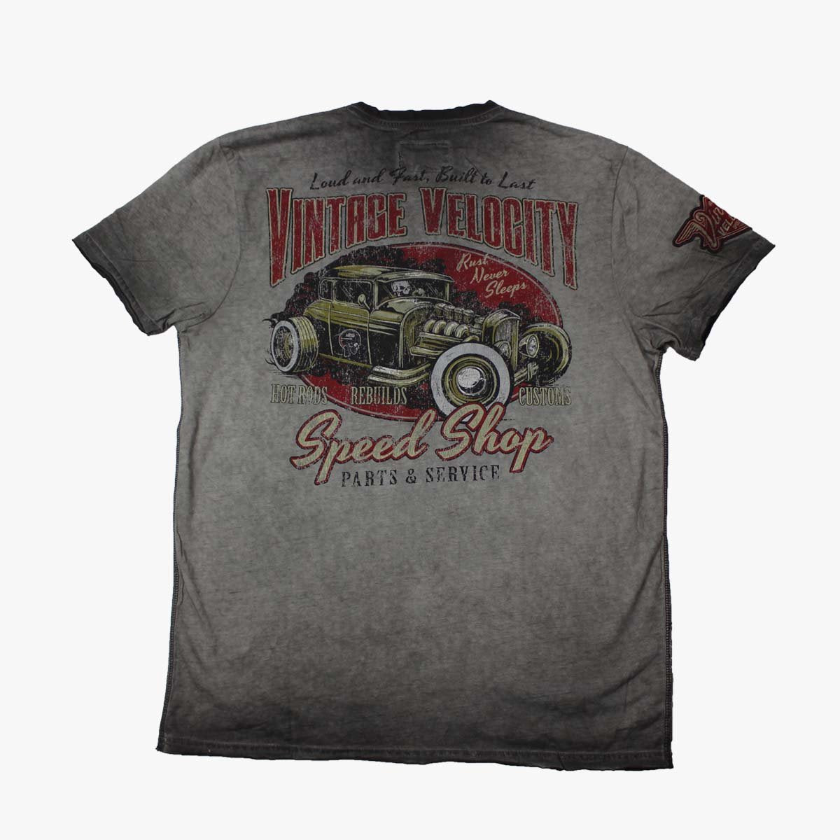 Adding to the vintage look are distressed edges, a distressed sleeve patch and machine-enzyme wash for a softer feel. That means the biker tee comes with a worn-in feeling that feels fine the moment you put it on. These motorcycle T-shirts have a fitted cut; order one size up for a looser fit. Get your Vintage Velocity Hot Rod Speed Shop tee here.