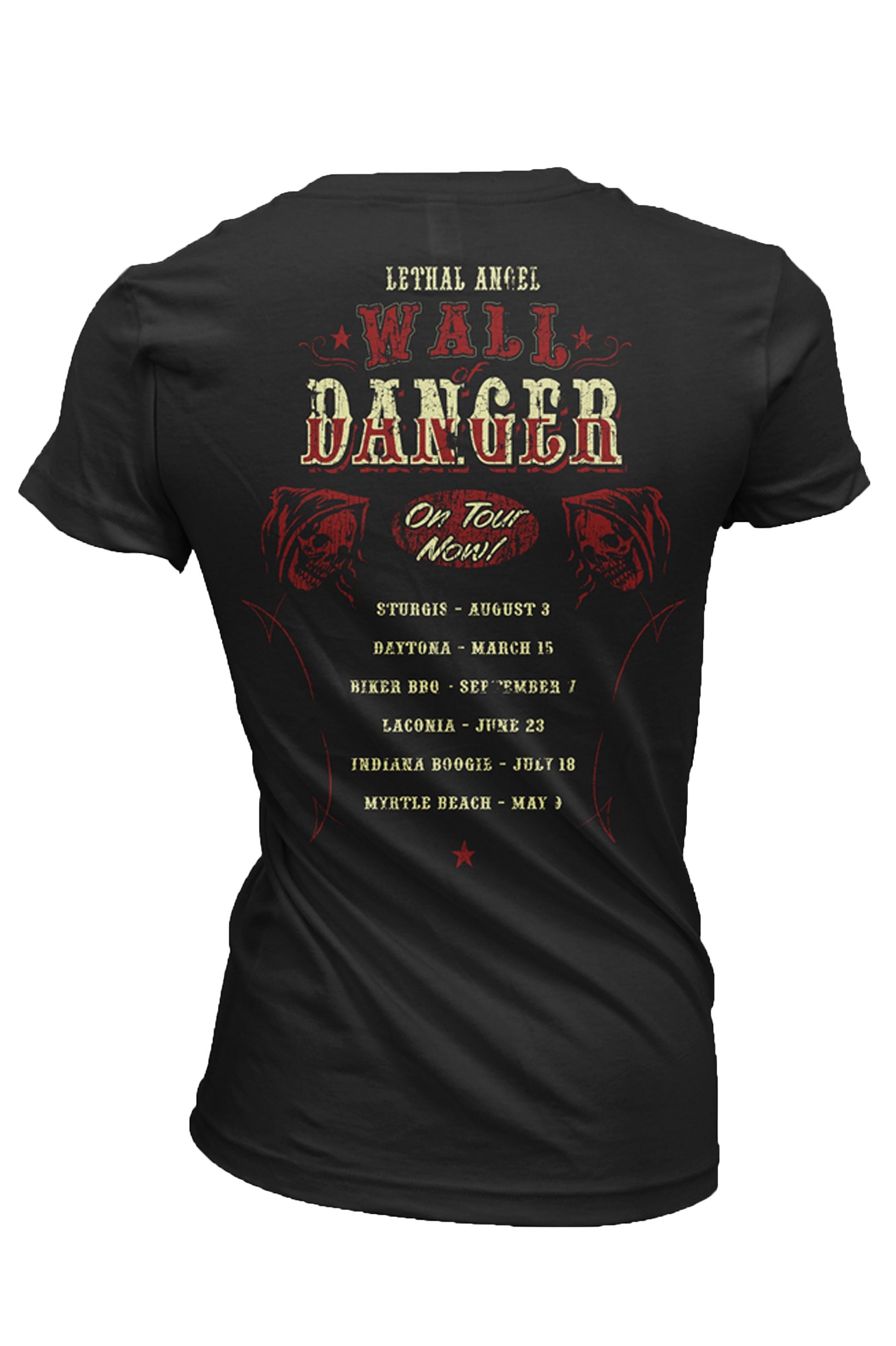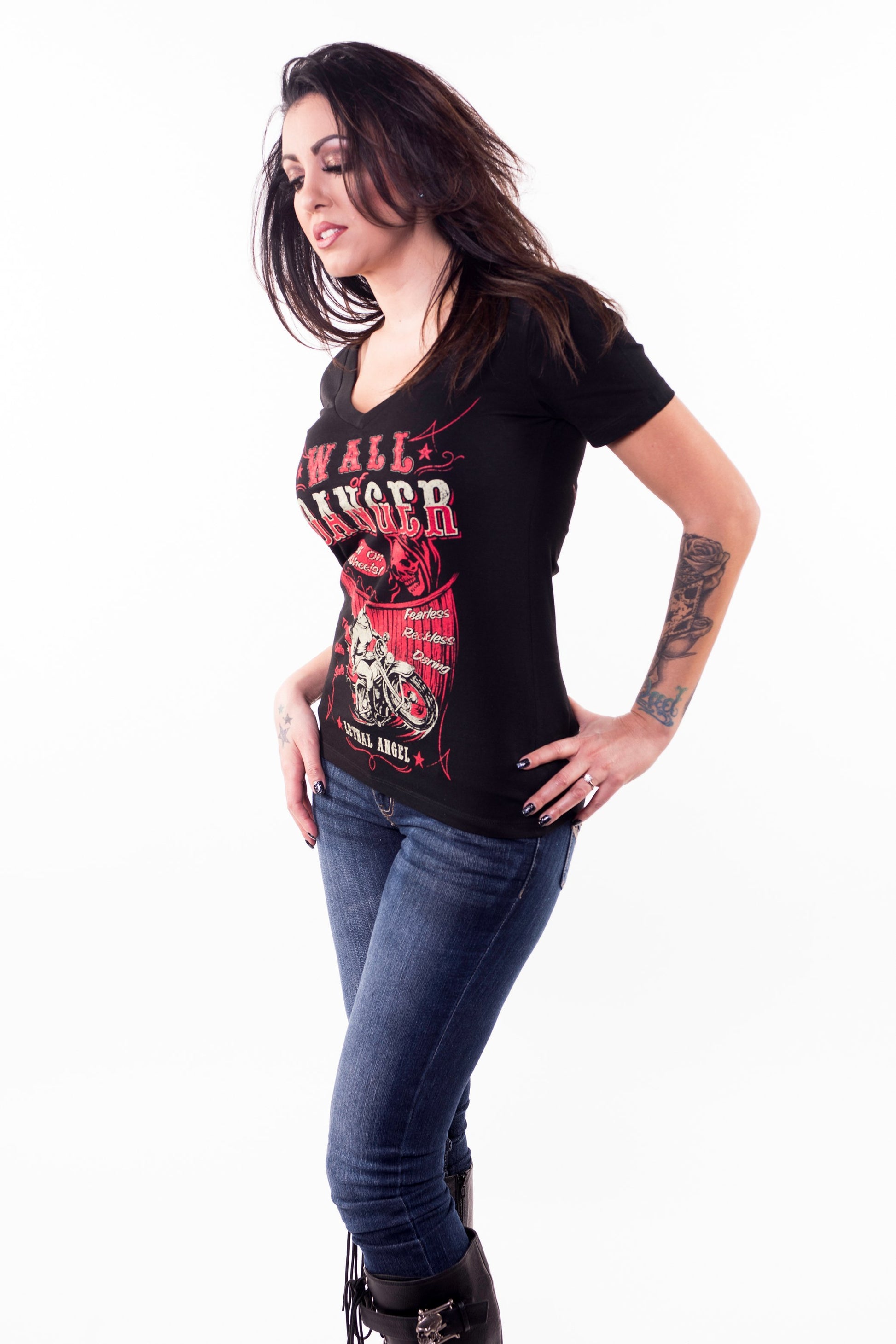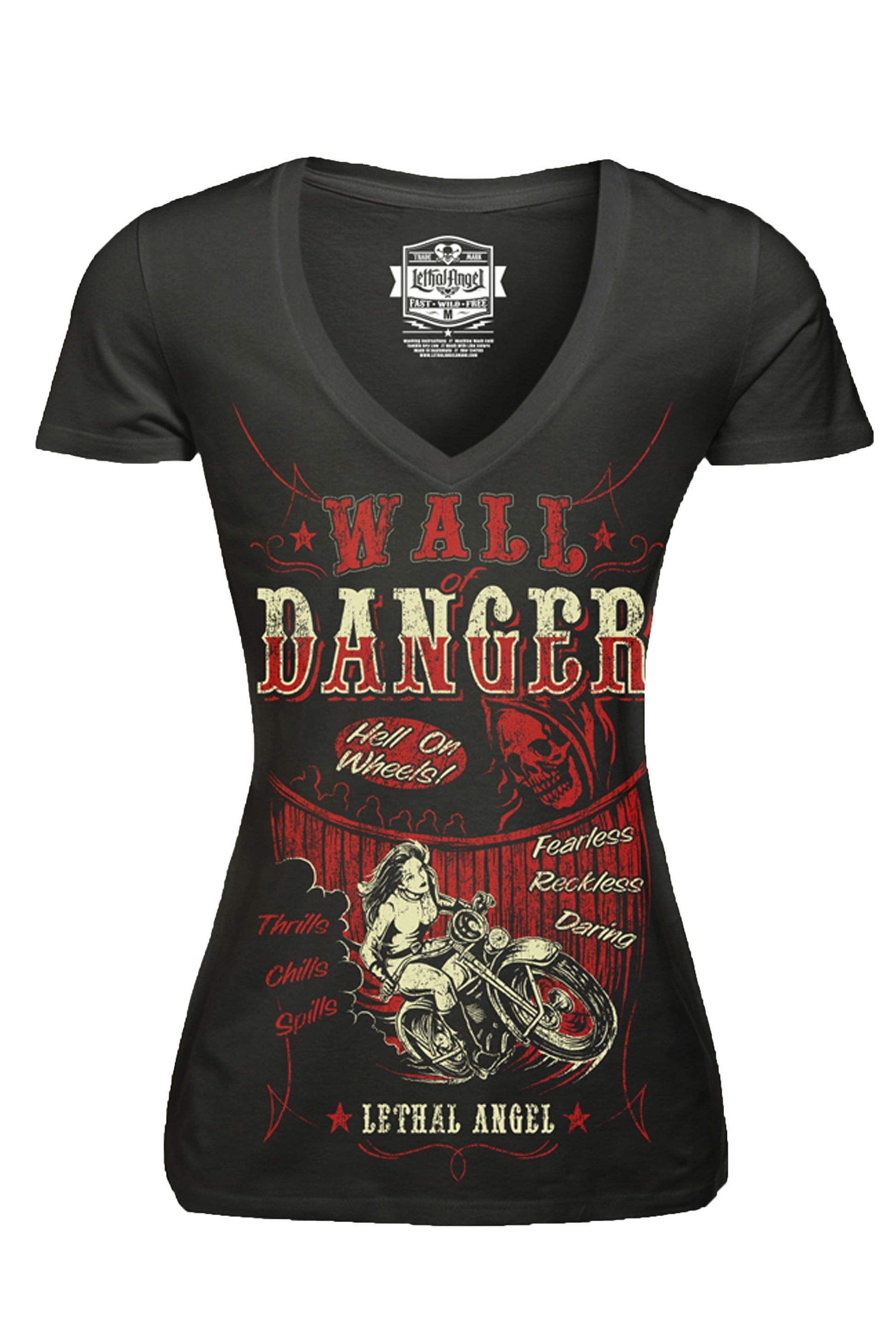 You can’t always go through life playing it safe. No risk, no reward. That’s why at Lethal Angel® we like to hop on your motorcycles and live life on our own terms. Our Wall of Danger black V-neck T-shirt is a tribute to all those daring women who toured the country back in the day riding a motorcycle within a round wooden track at blinding speeds. Surely these ladies were true Lethal Angels®.