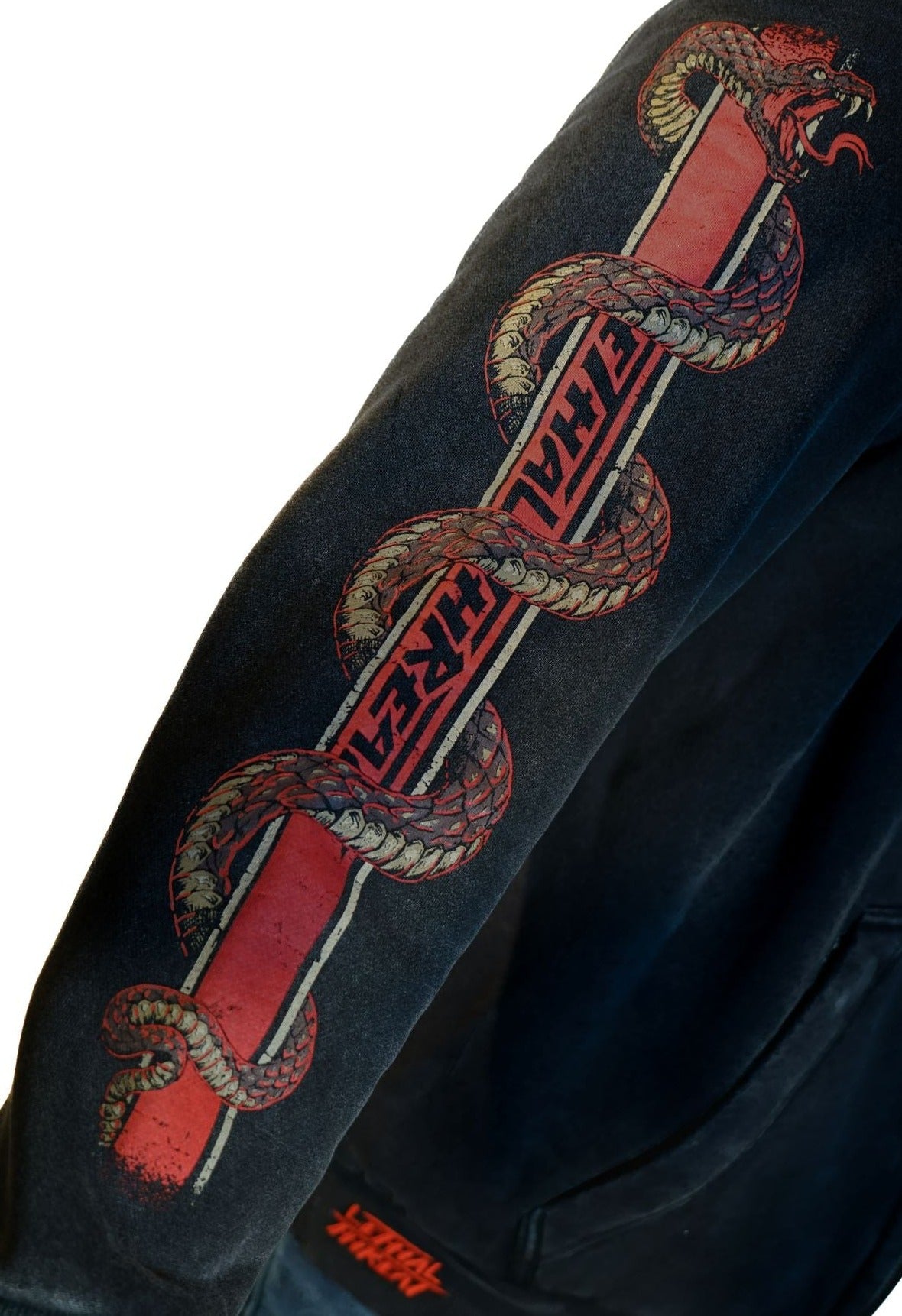 Have you ever wondered what it would look like to see a skull resting atop a piston and some wrenches all the while being wrapped up by a venomous viper, congratulations and wonder no longer because this hoodie has all that and then some. Not only does it feature copious amounts of detailed embroidery on the back but we've taken it a step further and wrapped another embroidered viper around the print on the sleeve as well as an embroidered snake & skull logo on the front. Whether you're out for a ride or simply looking to ad another layer to your outfit, this hoodie is the one for you.
