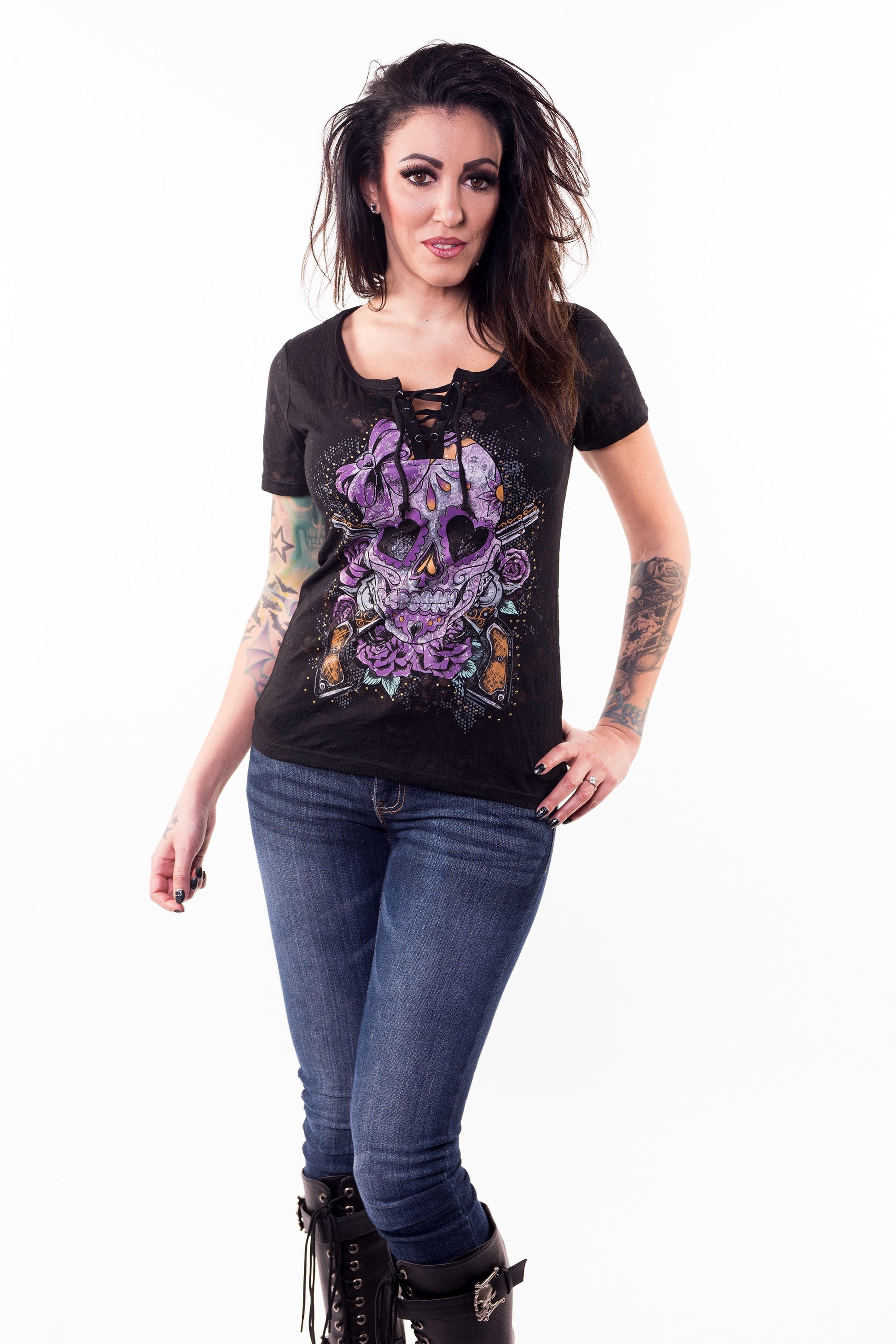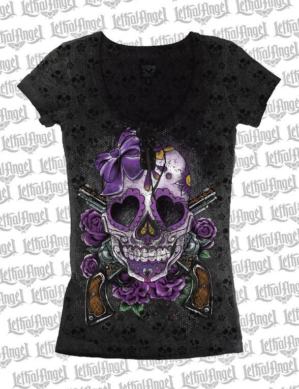 Day of the Dead Skull n Guns Burnout Lace Up T-shirt
