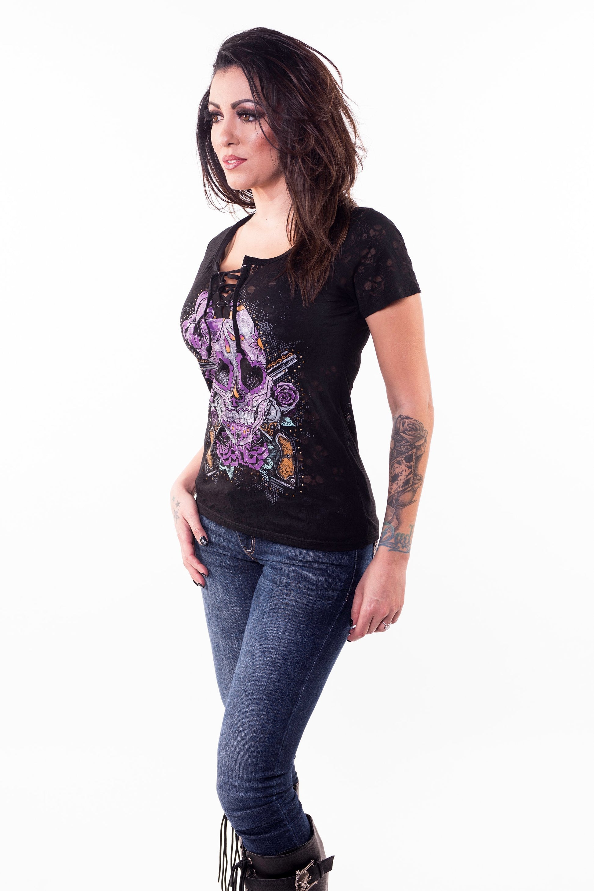 Vintage Day of the Dead Skull n Guns Burn Out Lace Up Tee