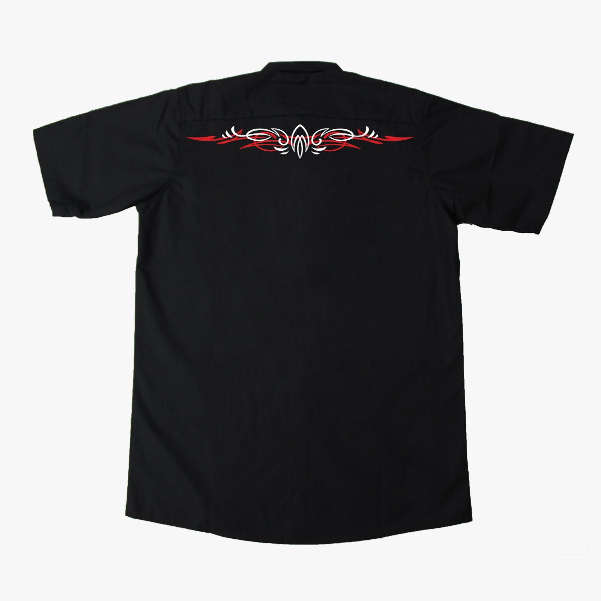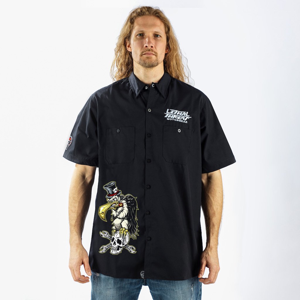 This old school buzzard design adorns this Lethal Threat work shirt. Intricate design embroidered on the lower left shirt panel. Lethal Threat skull gauge logo is embroidered on the sleeve and the back of the shirt features a two-color pinstripe design on the shoulders.