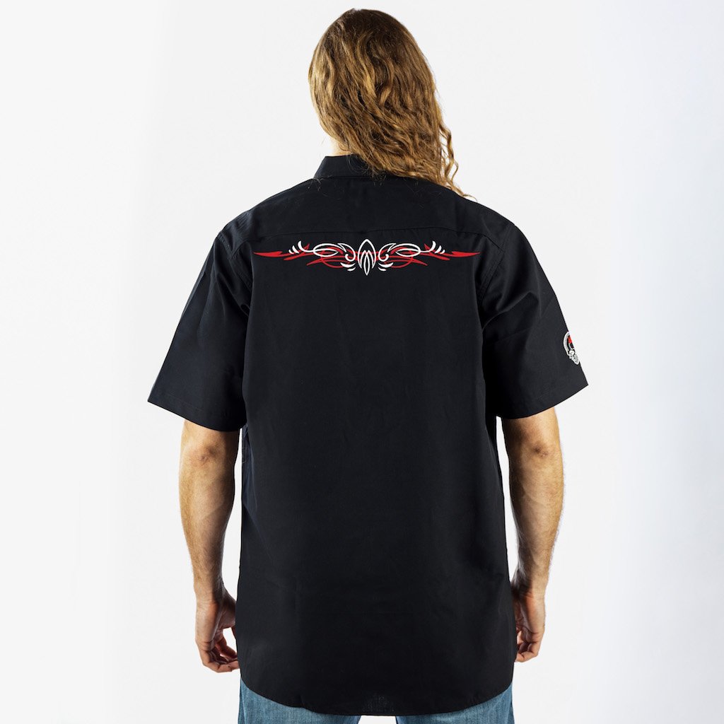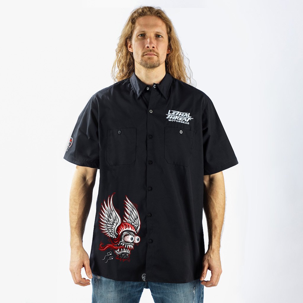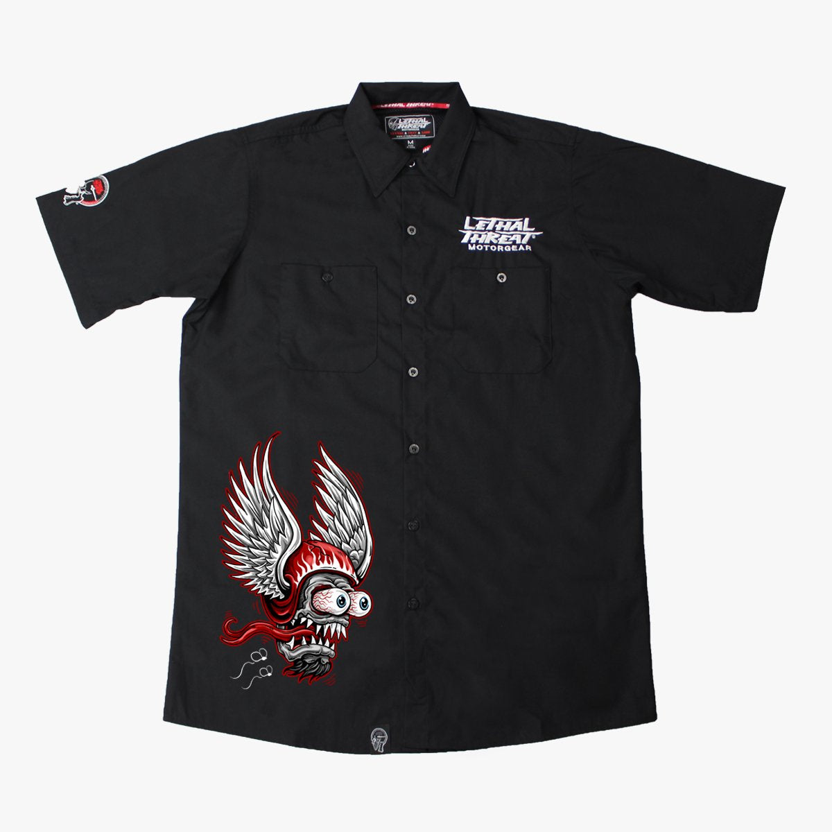 A design that is sure to catch some looks, this Winged Helmet Monster Work Shirt is sure to start some conversations. High quality embroidery produces a great look for this killer design. Intricate design embroidered on the lower left shirt panel. Lethal Threat skull gauge logo is embroidered on the sleeve. The back of the shirt features a two-color pinstripe design on the shoulders.